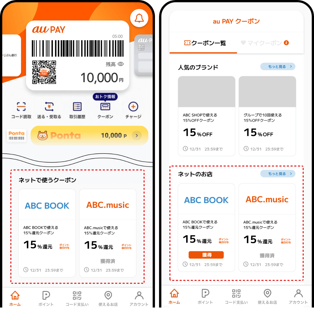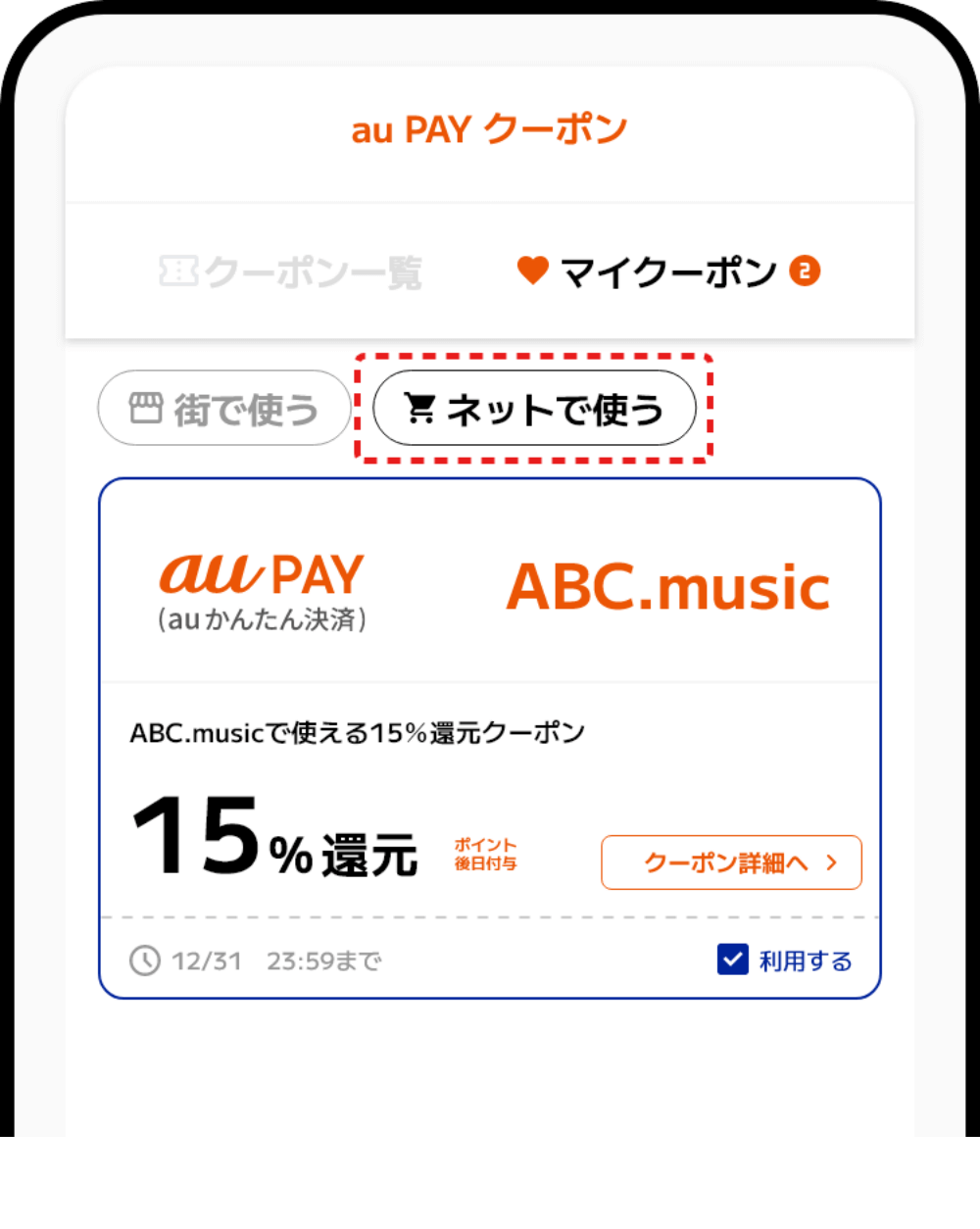 獲得したクーポンは、au PAYアプリの「マイクーポン」画面の「ネットで使う」タブでご確認いただけます。