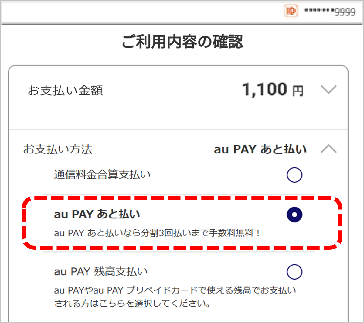 au PAY(auかんたん決済)の「お支払い方法」から「au PAY あと払い」を選択します。 -
