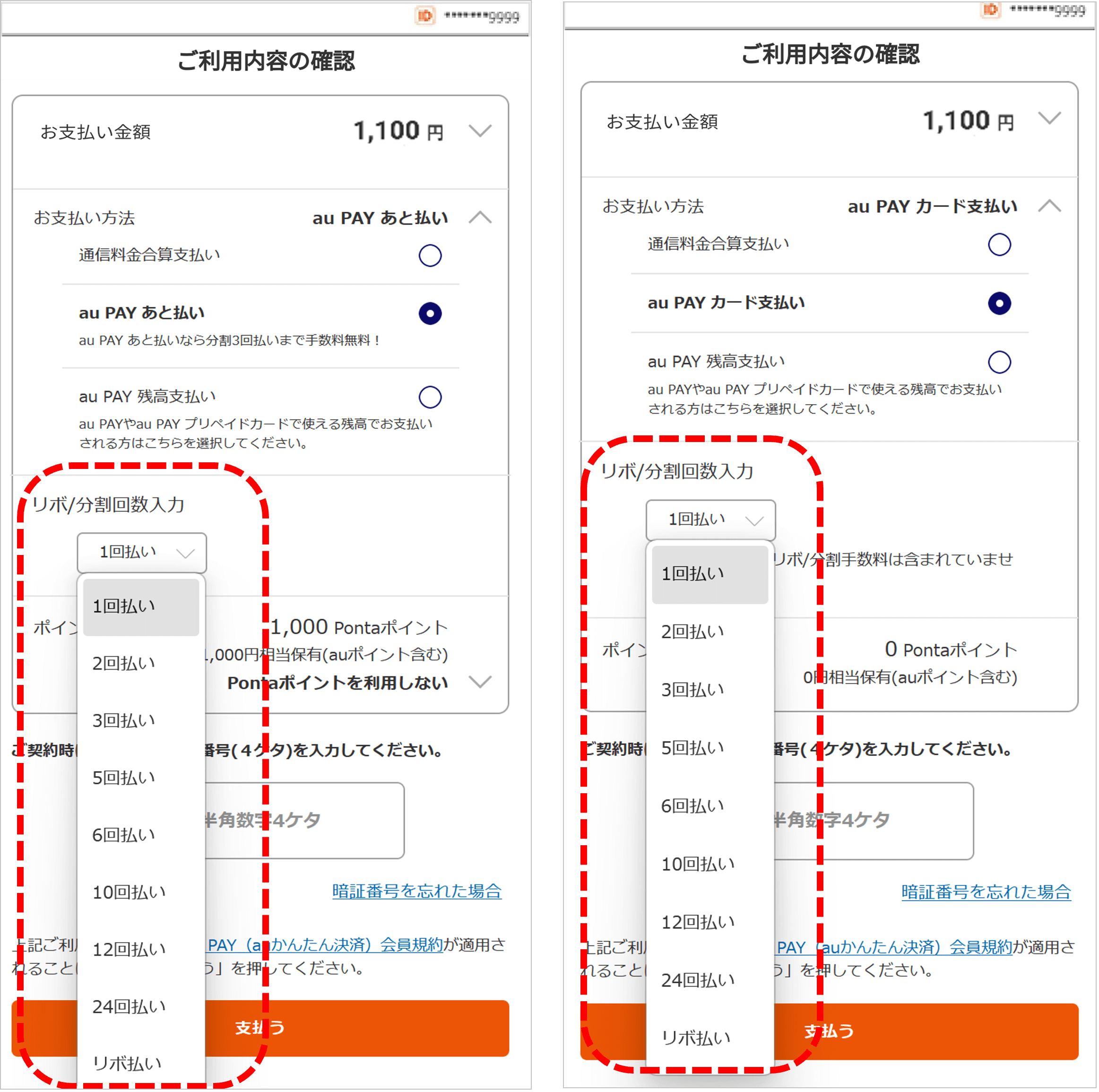 au PAY(auかんたん決済)では、au PAY カード支払い、またはau PAY あと払いを利用することができます。